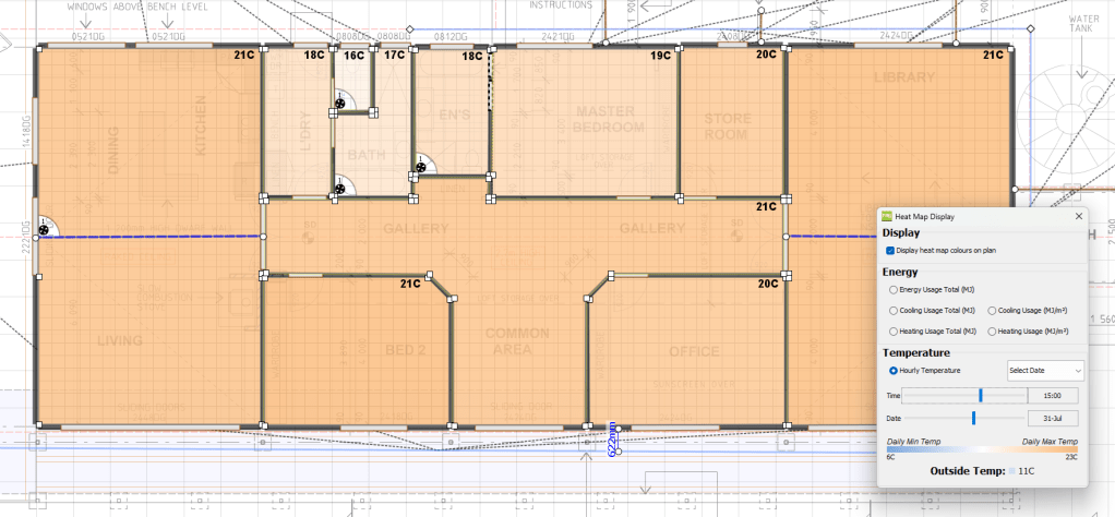 The software tool takes into account the house location and its physical design features – orientation, insulation, thermal mass, window types and locations… almost everything. Many people get NatHERS modelling done to just show the relevant authority that the proposed house meets the minimum energy requirements but doing only this is an absolute waste of what is an amazing design tool.