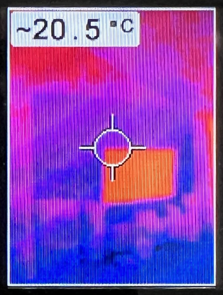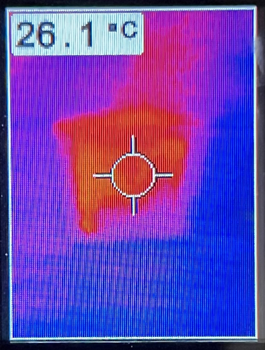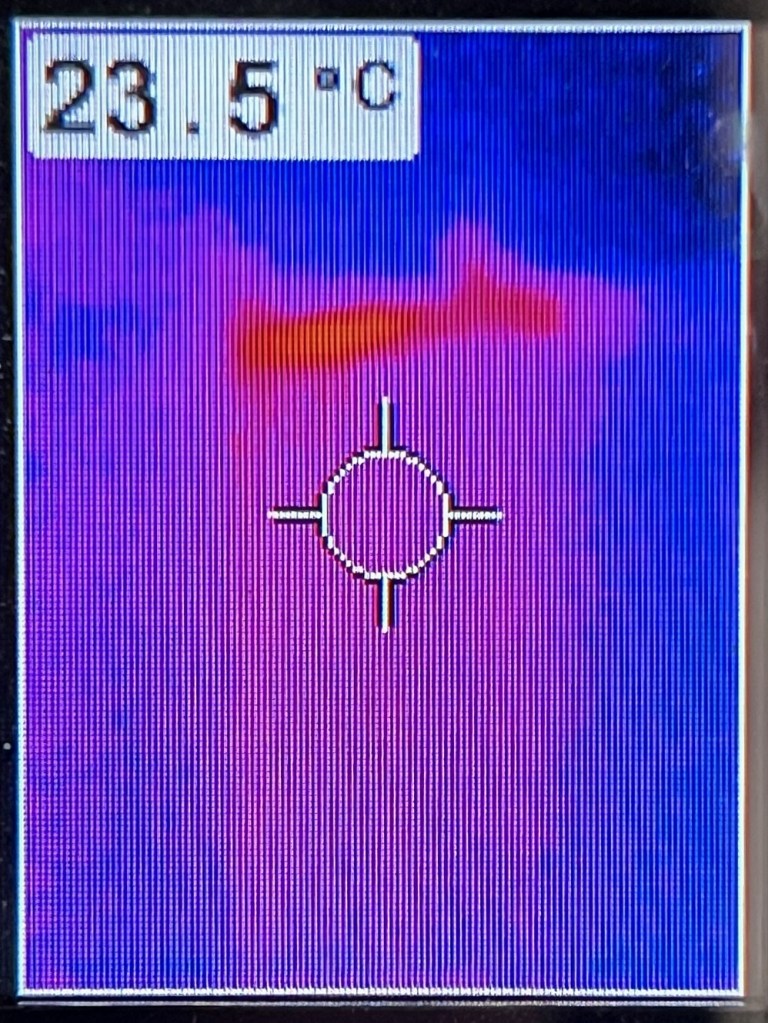 (Above) The western brick feature wall in the lounge room, with the TV that is mounted on it switched on. The wall can be seen to be cooler than the surrounding plasterboard, and especially cooler than the plasterboard wall that adjoins the roof space (top). The brick wall is a little warmer than the concrete slab (bottom). As can be seen, TVs release quite a lot of heat!(Above) The western double glazed, thermally broken aluminium framed door. Compared to the surrounding walls, the door allows the transfer of a lot of heat.(Above) Heat transmission through the wall insulation, upper south-east corner in the library. This has been sensed through the plasterboard – too late to fix now! Looking at a photo of the insulated wall taken before the plasterboard was installed, it appears the gap may be between the two upper timber plates. The evidence for this is that the heat entry extends past multiple bays in the framework – it would be unlikely I left gaps in the insulation in two adjoining bays. I sealed many of the gaps in the timber framework, but obviously not this one.(Above) Heat transmission around a downlight not yet sealed to the ceiling. The downlights that have been sealed show no detectable heat transmission (remembering that all the downlights are covered with ceiling insulation).