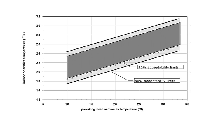 This adaptation to local conditions can be expressed in terms of ‘adaptive comfort’ levels, based on the mean outdoor temperature. The diagram above shows the relationship between comfort, indoor temperature and mean outdoor temperature. (Credit: ASHRAE)